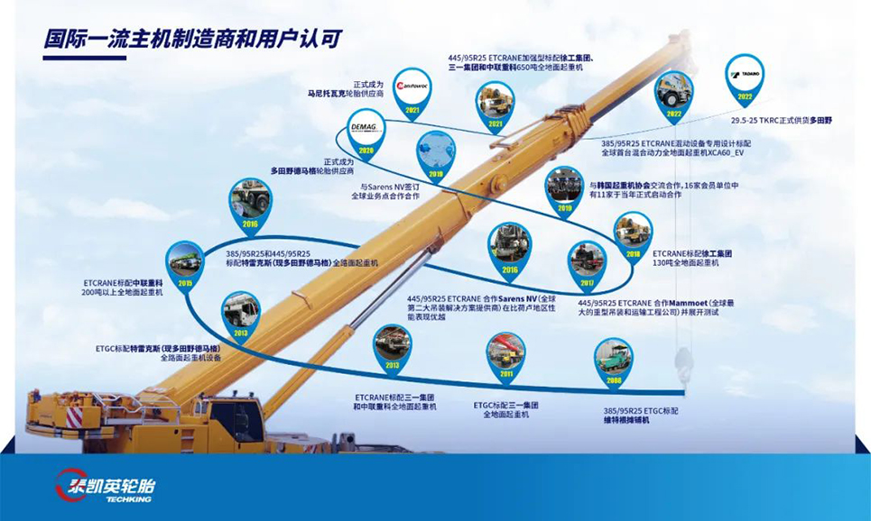 自2006年启动全路面起重机轮胎的研发至今,泰凯英已先后迭代推出了第一代ETGC、第二代ETCRANE及加强型等代表性产品,赢得了国内外起重机用户的高度赞誉。迄今为止,泰凯英是唯一一家同时为三一、徐工、中联重科提供工程机械配套的中国轮胎品牌,此外,泰凯英已与多田野德马格(前特雷克斯)合作有十年之久,2021年,泰凯英又经过重重严苛考验与马尼托瓦克建立合作伙伴关系。